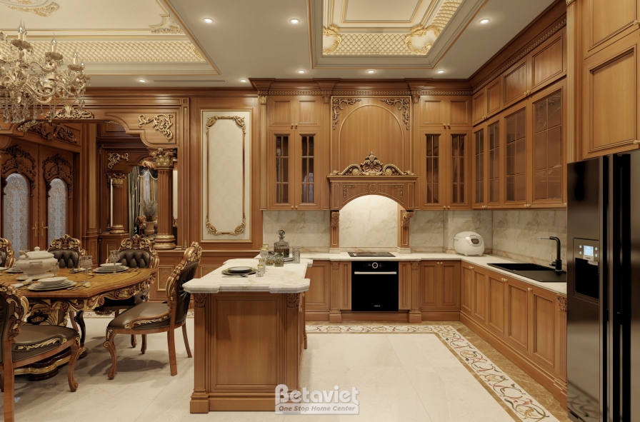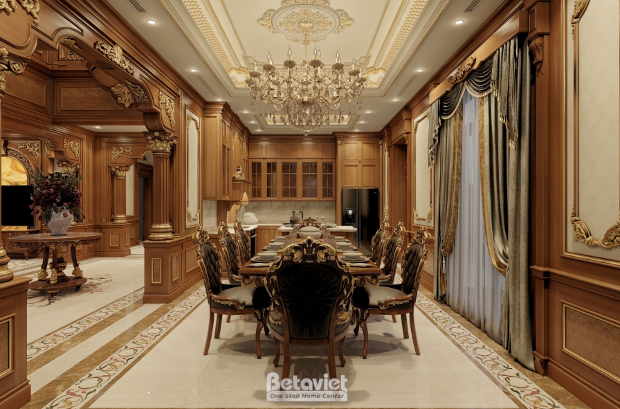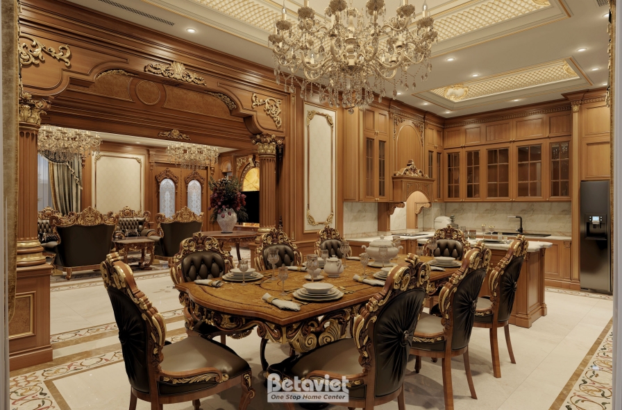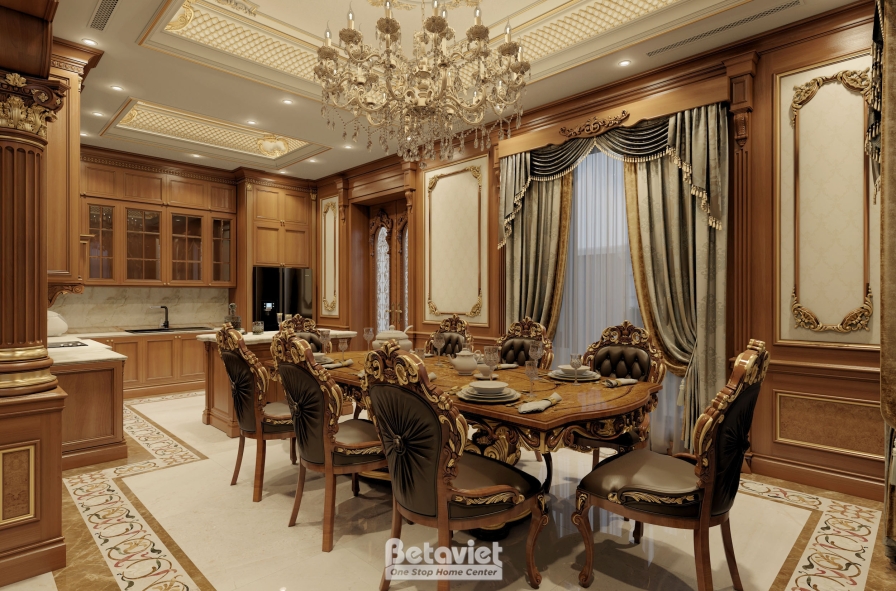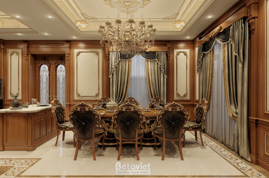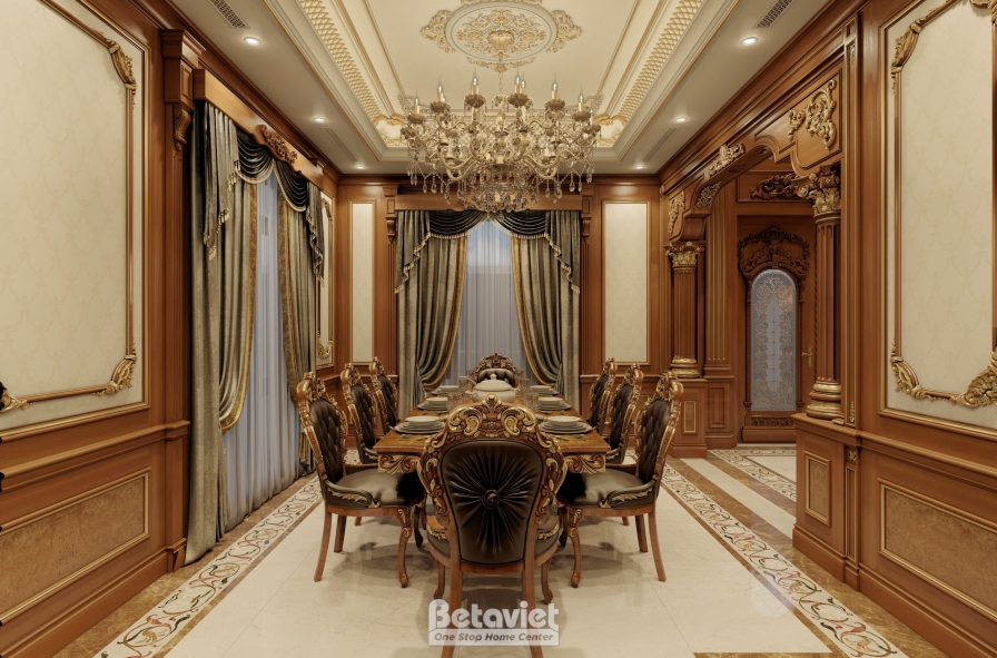Trung tâm của phòng ăn là bộ bàn ghế được thiết kế với tỷ lệ bề thế, toát lên vẻ uy nghi đặc trưng của phong cách hoàng gia. Mặt bàn gỗ tự nhiên cao cấp với các đường vân sắc nét kết hợp cùng phần chân bàn uốn cong mềm mại, được chạm khắc tinh xảo, tạo nên một tổng thể vừa mạnh mẽ vừa thanh lịch. Bao quanh là hệ ghế ăn tựa cao, bọc da cao cấp, mang lại cảm giác êm ái và thoải mái trong suốt quá trình sử dụng. Những chi tiết mạ vàng điểm xuyết trên tay ghế, viền bàn hay các đường nét trang trí chính là yếu tố nâng tầm giá trị thẩm mỹ, đồng thời khẳng định rõ dấu ấn đặc trưng của thiết kế nội thất cổ điển.