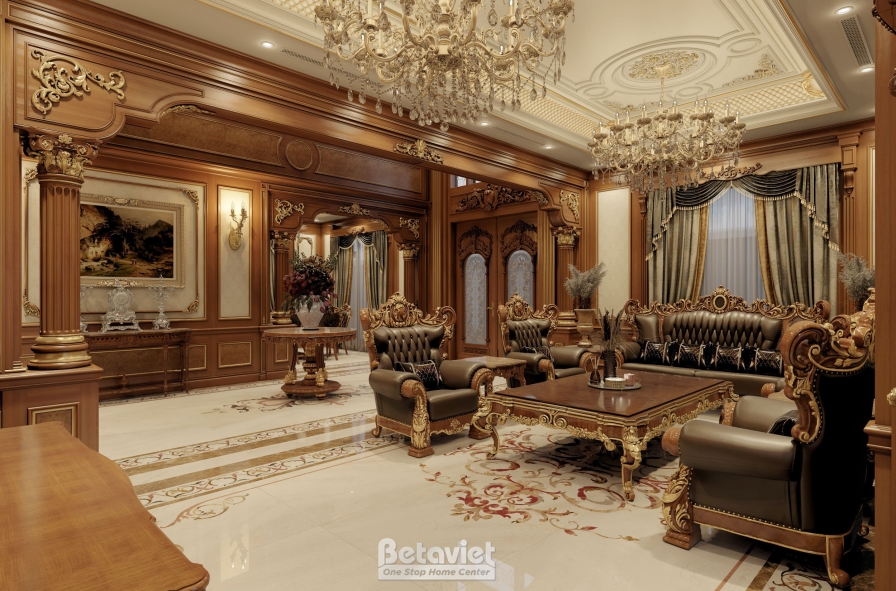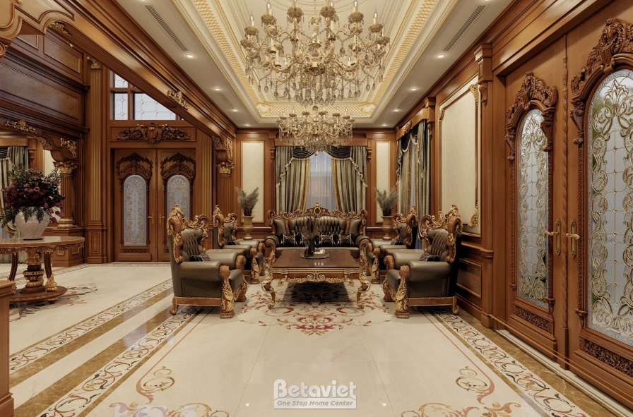 Trung tâm phòng khách là bộ sofa phong cách hoàng gia với khung gỗ chạm khắc tinh xảo, bọc da cao cấp. Bàn trà lớn với chân uốn cong mềm mại được đặt cân đối, tạo nên bố cục hài hòa. Sự kết hợp giữa gỗ, da, kim loại mạ vàng và pha lê mang lại một tổng thể vật liệu sang trọng, giàu cảm xúc.
