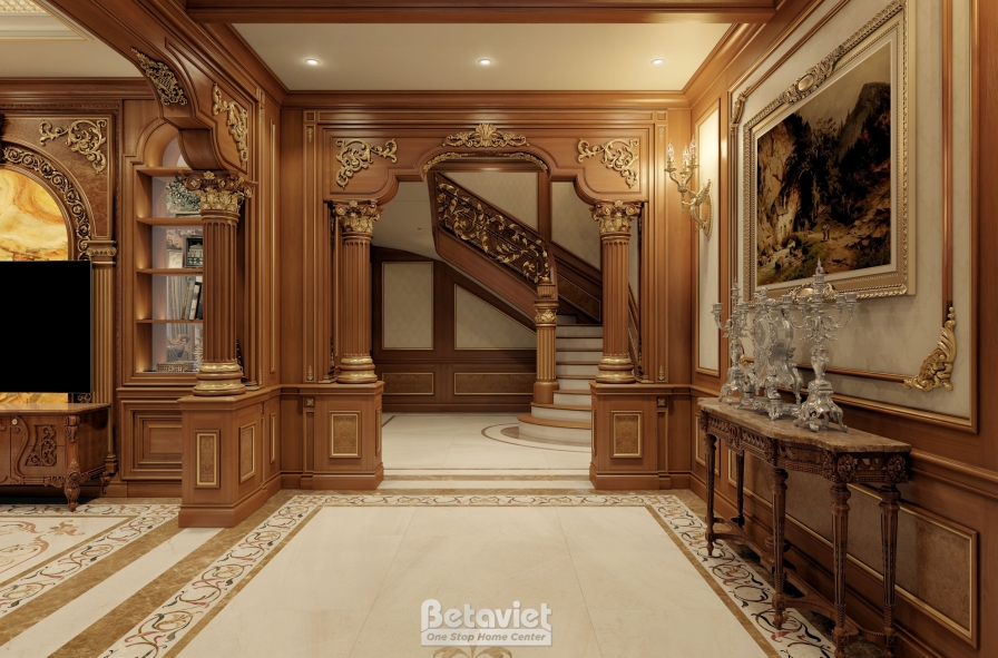 Hành lang trong biệt thự NT4104398 không chỉ đơn thuần là lối giao thông kết nối các không gian mà được kiến tạo như một phần nghệ thuật xuyên suốt toàn bộ công trình. Đây là khu vực thể hiện rõ tư duy thiết kế tổng thể, nơi từng chi tiết dù nhỏ nhất cũng được chăm chút kỹ lưỡng để góp phần hoàn thiện vẻ đẹp sang trọng và đẳng cấp của nội thất cổ điển.