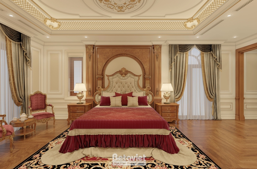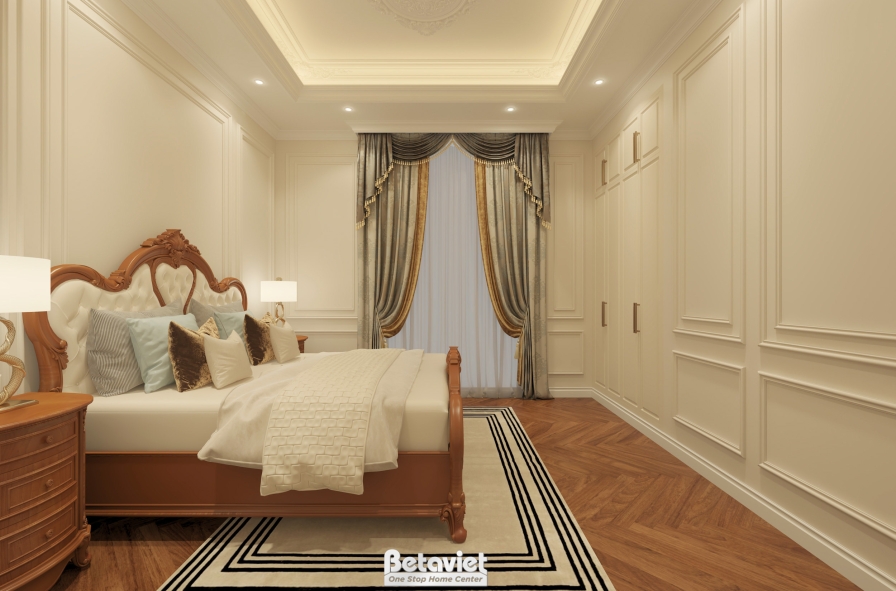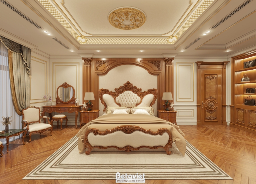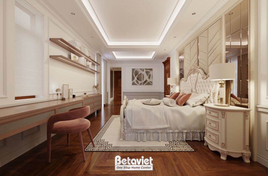 Tâm điểm của toàn bộ không gian là chiếc giường ngủ được thiết kế bề thế, nổi bật với phần đầu giường chạm khắc tinh xảo mang đậm dấu ấn cổ điển. Những đường cong mềm mại kết hợp họa tiết hoa văn uốn lượn được xử lý khéo léo, tạo nên vẻ đẹp quý phái nhưng không nặng nề. Lớp nệm bọc cao cấp không chỉ tăng tính thẩm mỹ mà còn mang lại cảm giác êm ái, nâng cao chất lượng giấc ngủ. Bao quanh khu vực trung tâm này là các món đồ nội thất như tab đầu giường, bàn trang điểm và kệ tivi – tất cả đều được thiết kế đồng bộ về kiểu dáng, chất liệu và chi tiết trang trí. Sự nhất quán này giúp không gian trở nên hài hòa, liền mạch và thể hiện rõ sự đầu tư bài bản trong thiết kế.