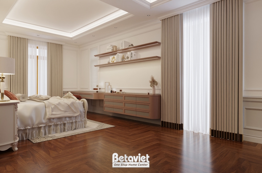 Ánh sáng trong phòng được xử lý theo nhiều lớp, với hệ đèn âm trần kết hợp đèn ngủ hai bên giường tạo nên nguồn sáng vàng dịu nhẹ, giúp không gian luôn ấm cúng và thư giãn. Sàn gỗ xương cá cao cấp không chỉ tăng giá trị thẩm mỹ mà còn mang lại cảm giác gần gũi, dễ chịu dưới mỗi bước chân. Tất cả các yếu tố từ vật liệu, màu sắc đến ánh sáng đều được tính toán kỹ lưỡng, góp phần tạo nên một không gian phòng ngủ không chỉ đẹp mà còn thực sự đáng sống – nơi gia chủ có thể tái tạo năng lượng và tận hưởng trọn vẹn sự bình yên sau một ngày dài.