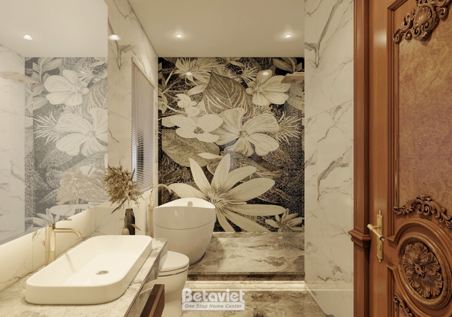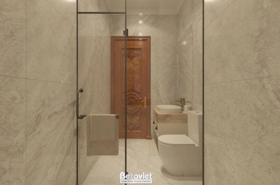 Tổng thể phòng tắm nổi bật với sự kết hợp hài hòa giữa vật liệu đá trắng vân mây, kính và gỗ tự nhiên. Bề mặt đá sáng màu với những đường vân mềm mại không chỉ mang lại cảm giác sạch sẽ, thoáng đãng mà còn giúp không gian trở nên rộng mở hơn. Kính trong suốt được sử dụng để phân tách các khu vực chức năng một cách tinh tế, tạo sự liền mạch mà không làm gián đoạn tầm nhìn. Trong khi đó, các chi tiết gỗ với gam màu ấm đóng vai trò cân bằng thị giác, giúp không gian không bị lạnh lẽo mà trở nên gần gũi và dễ chịu hơn.