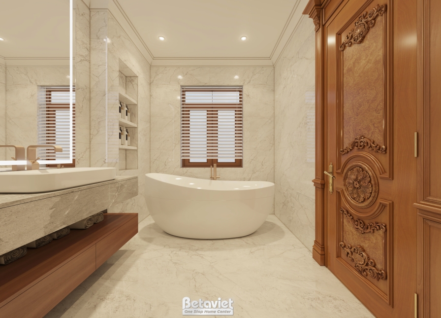 Điểm nhấn nổi bật của phòng tắm chính là bồn tắm độc lập được đặt tại vị trí trung tâm. Với kiểu dáng bo tròn mềm mại và thiết kế tinh giản, bồn tắm không chỉ là thiết bị chức năng mà còn được xem như một “tác phẩm nghệ thuật” trong không gian. Cách bố trí này mang đến cảm giác như đang tận hưởng dịch vụ tại các khu nghỉ dưỡng cao cấp, giúp gia chủ thư giãn tuyệt đối sau những giờ làm việc căng thẳng.