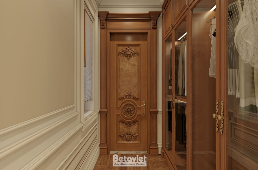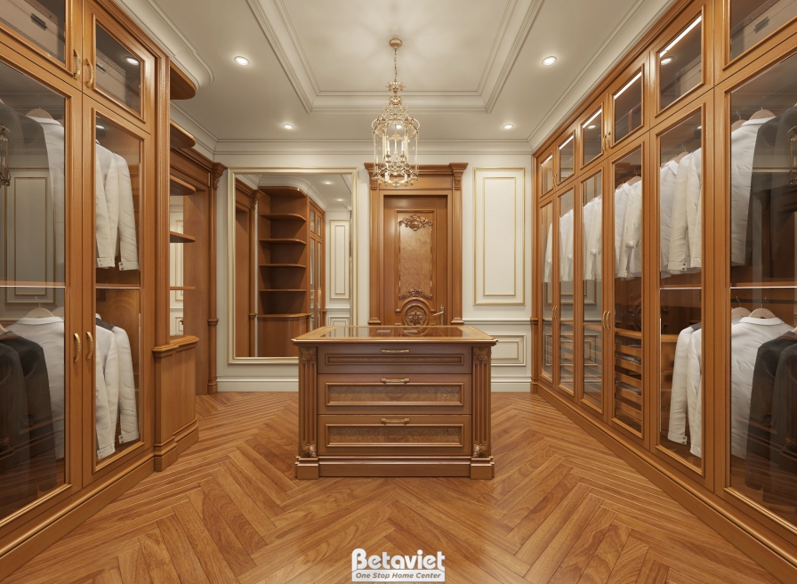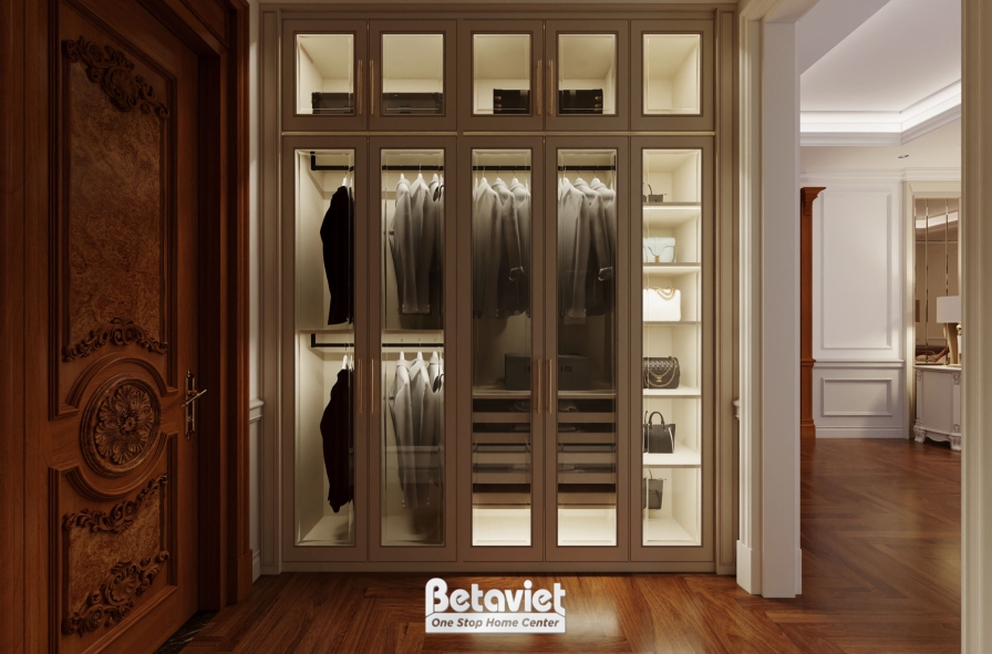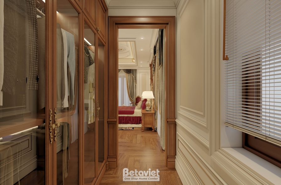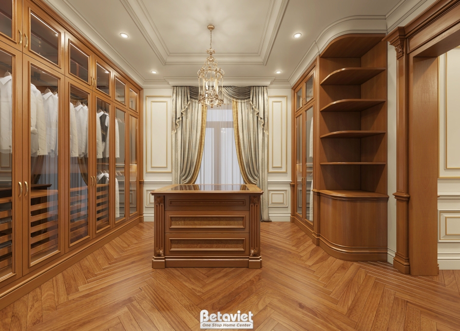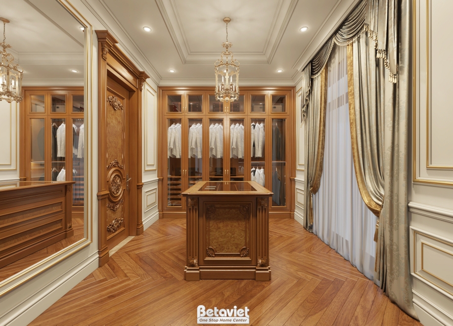Điểm nhấn nổi bật của phòng thay đồ chính là hệ tủ quần áo sử dụng gỗ tự nhiên cao cấp, được bố trí theo nguyên tắc đối xứng – một đặc trưng tiêu biểu của phong cách cổ điển. Các khoang tủ được phân chia khoa học theo từng chức năng như treo đồ, gấp đồ, trưng bày phụ kiện, giúp tối ưu hóa khả năng lưu trữ mà vẫn đảm bảo sự gọn gàng. Cánh tủ kính trong suốt không chỉ giúp gia chủ dễ dàng quan sát và lựa chọn trang phục mà còn tạo hiệu ứng trưng bày đẹp mắt, biến mỗi món đồ thành một “tác phẩm” trong không gian. Khi kết hợp cùng hệ đèn LED âm tủ, toàn bộ hệ tủ trở nên nổi bật, sang trọng và chuyên nghiệp hơn, giống như một cửa hàng thời trang cao cấp.