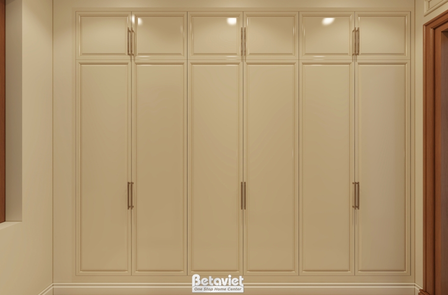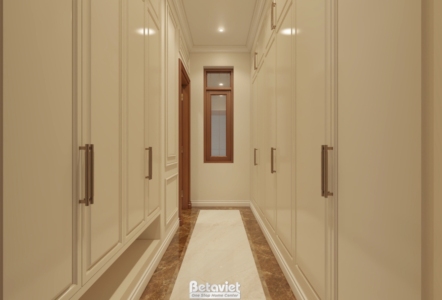 Một yếu tố quan trọng khác chính là cách tổ chức mặt bằng khoa học. Lối đi giữa các hệ tủ được tính toán rộng rãi, tạo sự thuận tiện trong di chuyển và sử dụng. Các khu vực chức năng được phân chia rõ ràng nhưng vẫn liên kết hài hòa, giúp gia chủ có trải nghiệm sử dụng liền mạch, tiện nghi. Tất cả những yếu tố này đã tạo nên một không gian phòng thay đồ không chỉ đẹp về hình thức mà còn tối ưu về công năng – nơi thể hiện rõ gu thẩm mỹ tinh tế và phong cách sống đẳng cấp của chủ nhân biệt thự.