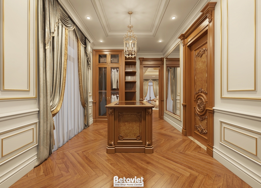 Không gian phòng thay đồ còn được hoàn thiện với sàn gỗ xương cá cao cấp – một lựa chọn mang tính biểu tượng của sự sang trọng. Kiểu lát này không chỉ tạo hiệu ứng thị giác độc đáo mà còn tăng chiều sâu cho không gian. Phía trên, đèn chùm pha lê được bố trí tại trung tâm trần, mang lại ánh sáng lung linh và cảm giác xa hoa đặc trưng. Kết hợp cùng hệ đèn âm trần phân bổ đều, không gian luôn đảm bảo đủ sáng ở mọi khu vực, đồng thời làm nổi bật chất liệu và đường nét nội thất.
