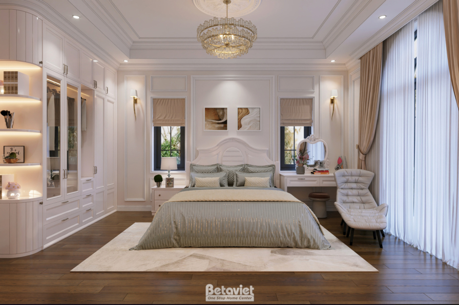 Phòng ngủ Master là không gian nghỉ dưỡng riêng tư của gia chủ. Với sự kết hợp giữa gỗ tự nhiên và ngôn ngữ thiết kế hiện đại, căn phòng mang lại sự sang trọng, thư thái. Giường ngủ thiết kế tinh giản, kết hợp ánh sáng tự nhiên từ cửa sổ lớn và đèn led âm trần, mang đến bầu không khí thoải mái. Từng chi tiết nhỏ, từ bàn trang điểm đến thảm trải sàn đều thể hiện tinh thần thiết kế nội thất phòng ngủ đẹp. Đây là một phòng ngủ tân cổ điển đầy cuốn hút, vừa ấm áp vừa trường tồn.