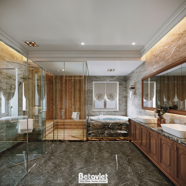 Ấn tượng đầu tiên về không gian này đến từ chất liệu và màu sắc được lựa chọn vô cùng tinh tế. Toàn bộ sàn và tường được ốp đá marble vân mây màu ghi xám cao cấp, tạo nên vẻ đẹp bền vững, mát mẻ và thanh lịch. Hệ trần phẳng trắng cùng với ánh sáng âm trần và đèn hắt phía sau gương tạo hiệu ứng phản chiếu nhẹ nhàng, mang đến sự thoáng đãng và thư thái cho người sử dụng – một yếu tố không thể thiếu trong các mẫu nội thất phòng tắm biệt thự.
