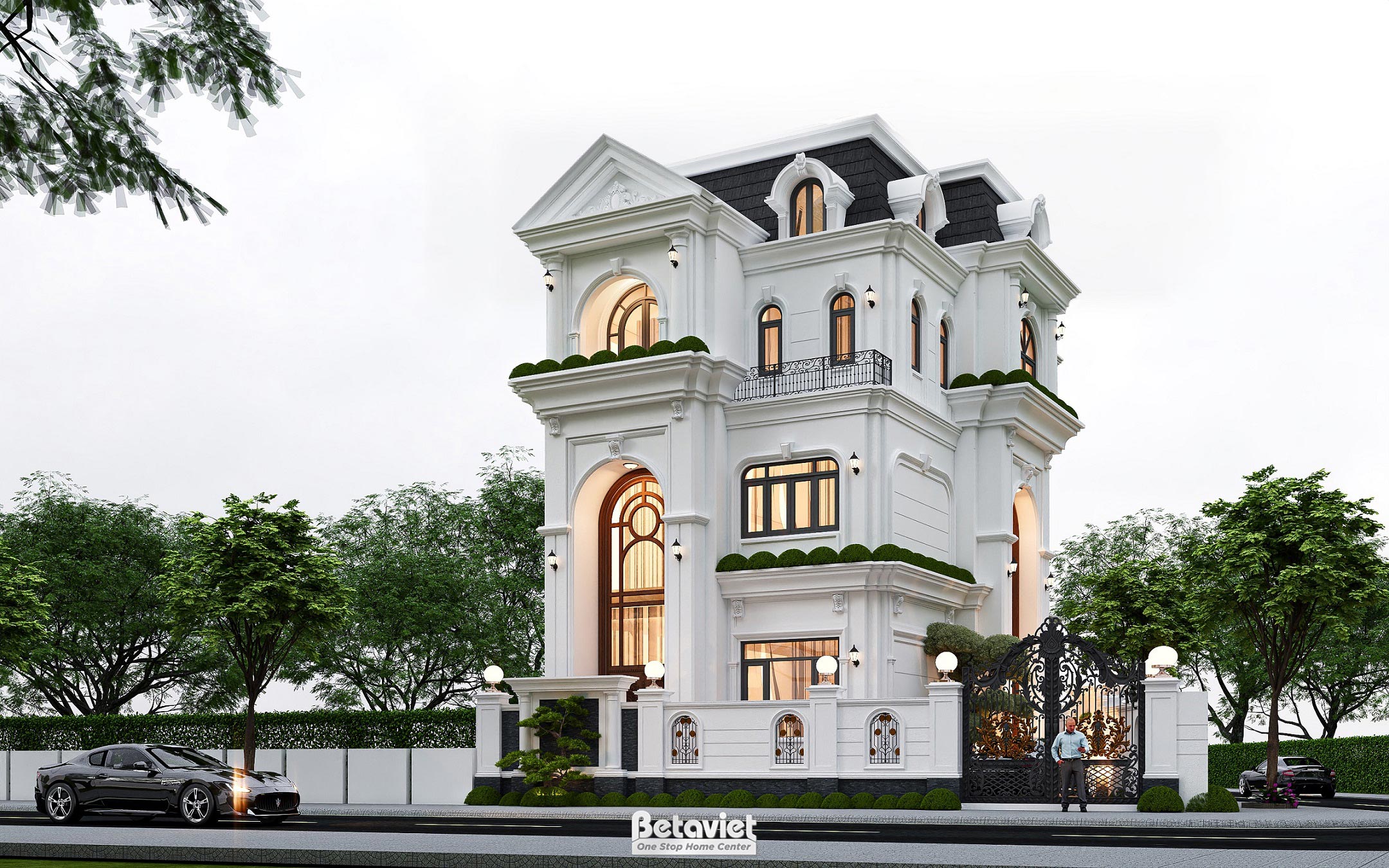 Đặc biệt, tầng tum không chỉ đóng vai trò là “chiếc mũ” hoàn thiện vẻ đẹp kiến trúc mà còn được tận dụng làm không gian tâm linh trang trọng cùng một vườn treo trên cao. Đây chính là khoảng thở đắt giá giữa lòng phố thị, nơi ta có thể tổ chức những bữa tiệc BBQ ngoài trời hay đơn giản là nhâm nhi tách cà phê dưới ánh hoàng hôn. Với gam màu trắng sứ chủ đạo làm tôn lên những chi tiết phù điêu thủ công tỉ mỉ, ngôi nhà không chỉ là nơi để ở, mà còn là biểu tượng cho sự thành đạt, gu thẩm mỹ tinh tế và một phong cách sống đẳng cấp, trường tồn cùng thời gian.