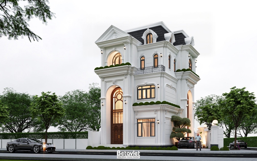 Với diện tích mặt bằng 8x14m, ngôi nhà hiện lên như một tác phẩm nghệ thuật kiến trúc Tân cổ điển đầy kiêu hãnh, nơi vẻ đẹp của những giá trị truyền thống Pháp hòa quyện hoàn hảo cùng hơi thở thời đại. Ngay từ cái nhìn đầu tiên, công trình gây ấn tượng mạnh bởi sự bề thế của hệ mái Mansard quyền quý kết hợp cùng những đường phào chỉ thanh mảnh, tạo nên một tổng thể vừa uy nghi, vừa thanh thoát. Điểm nhấn đắt giá nhất nằm ở những ô cửa vòm cao vút xuyên tầng, không chỉ là giải pháp lấy sáng thông minh mà còn là “nhãn quan” đầy nghệ thuật, giúp xóa nhòa ranh giới giữa không gian nội thất sang trọng và thiên nhiên xanh mát bên ngoài.