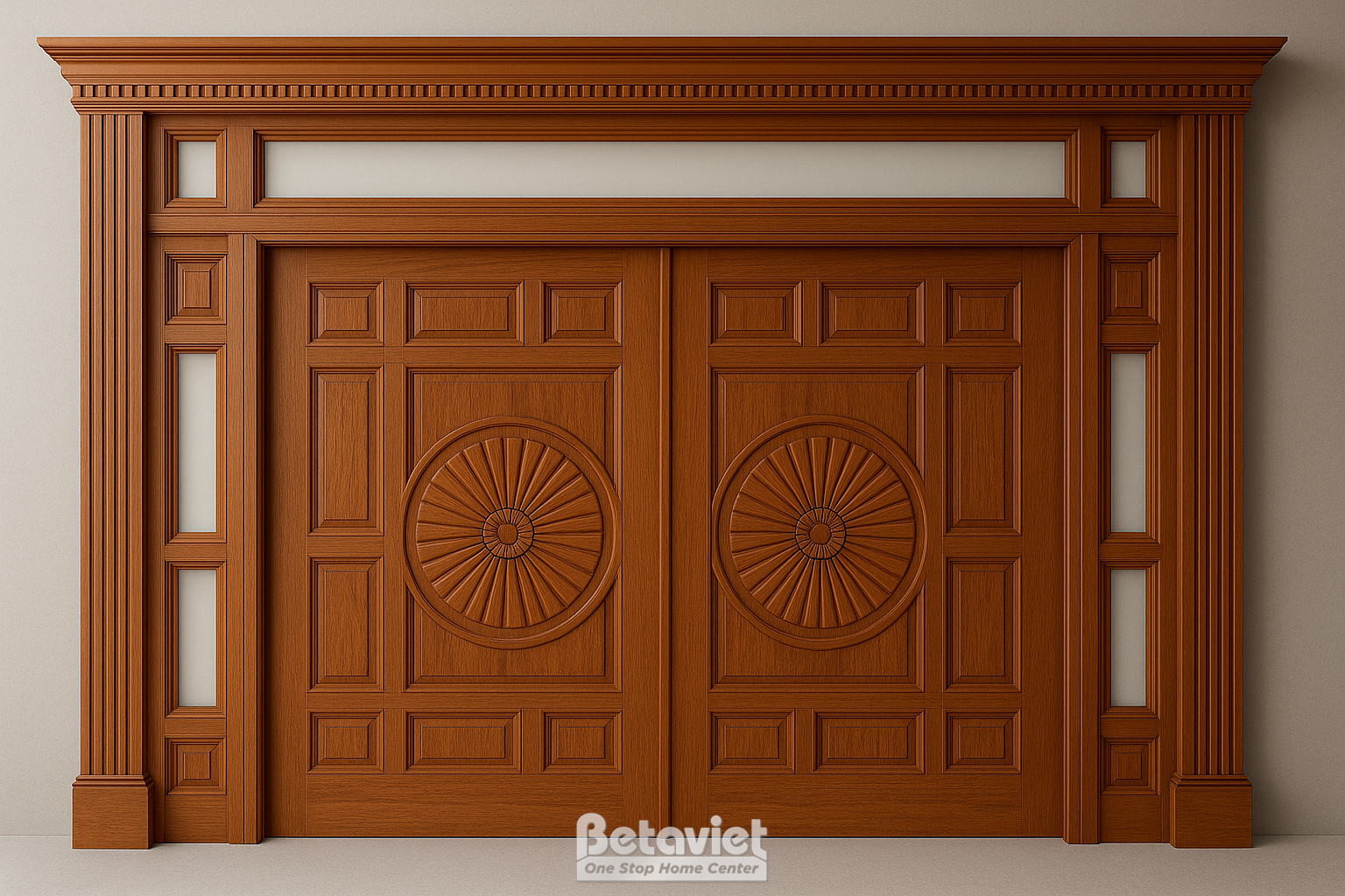 Mẫu cửa gỗ này khá nhẹ nhàng và kín đáo, phù hợp với nhiều gia đình Việt hiện nay. Thông thường, với hệ cửa này, gỗ được sử dụng là gỗ đặc, không chứa hoa sắt hay pano kính, đem lại vẻ đẹp bề thế và vững chắc cho căn nhà. Điểm đặc biệt của mẫu cửa này chính là phần hoa văn nổi trang trí trên cửa, tạo điểm nhấn cho căn phòng, tinh tế và thích hợp với những căn biệt thự đa dạng phong cách: từ cổ điển, tân cổ điển cho đến hiện đại hay các mẫu biệt thự truyền thống.