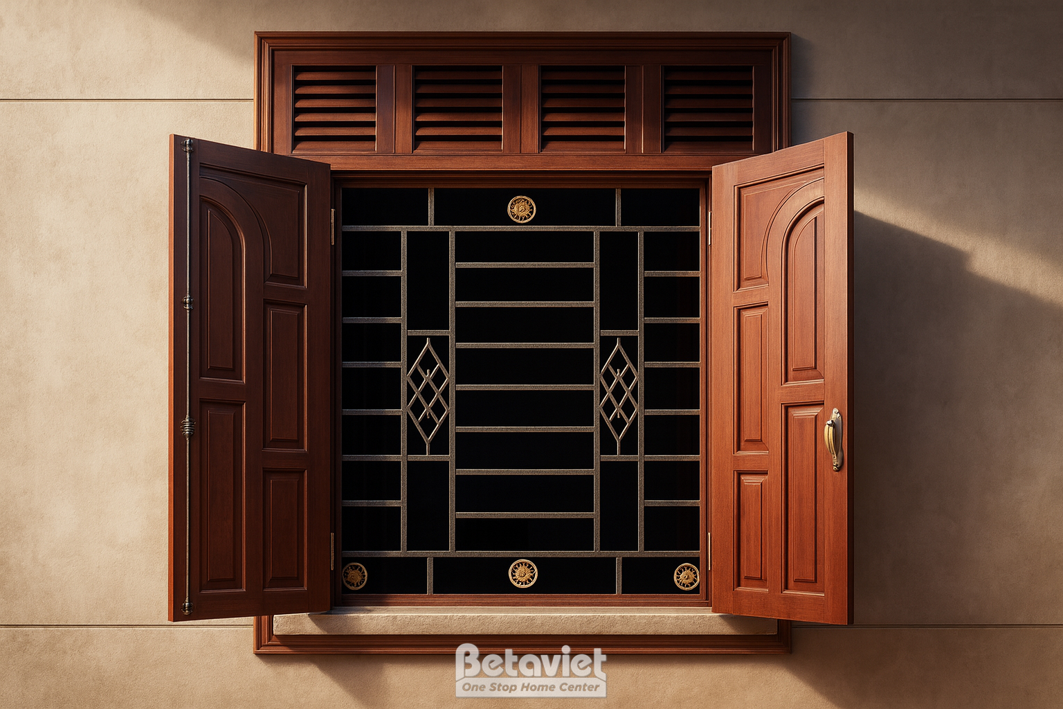 Những không gian kiến trúc cổ điển hay một không gian nhà có diện tích vừa phải, những mẫu cửa 2 cánh sẽ hợp lý hơn hẳn. Phần thiết kế cửa sổ khá đơn giản với những đường nét cong, thẳng hài hòa, pano kính được lắp giữa, hai bên cánh được xiên hình hoa bán nguyệt tạo nên hình tròn mềm mại, uốn lượn đẹp mắt.